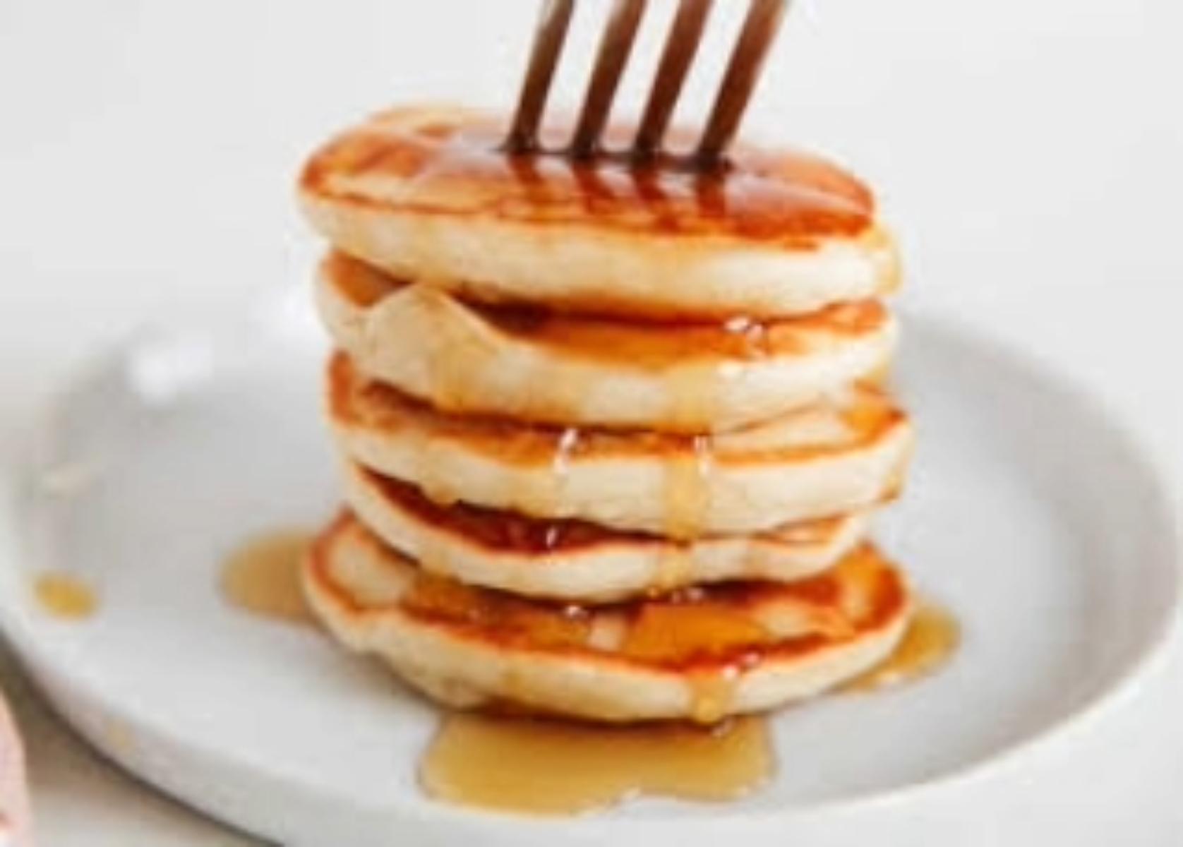 3 fluffy pancakes with butter and syrup on the side. Add Chocolate Chips or strawberry topping.