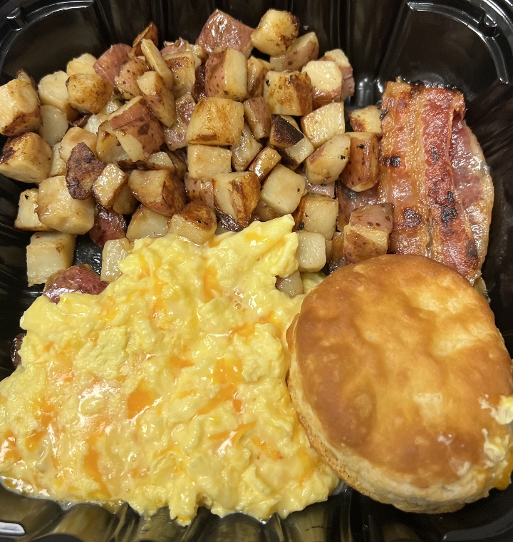 Scrambled eggs (with or without cheese,) two breakfast meats, home fries, and our house made biscuits.